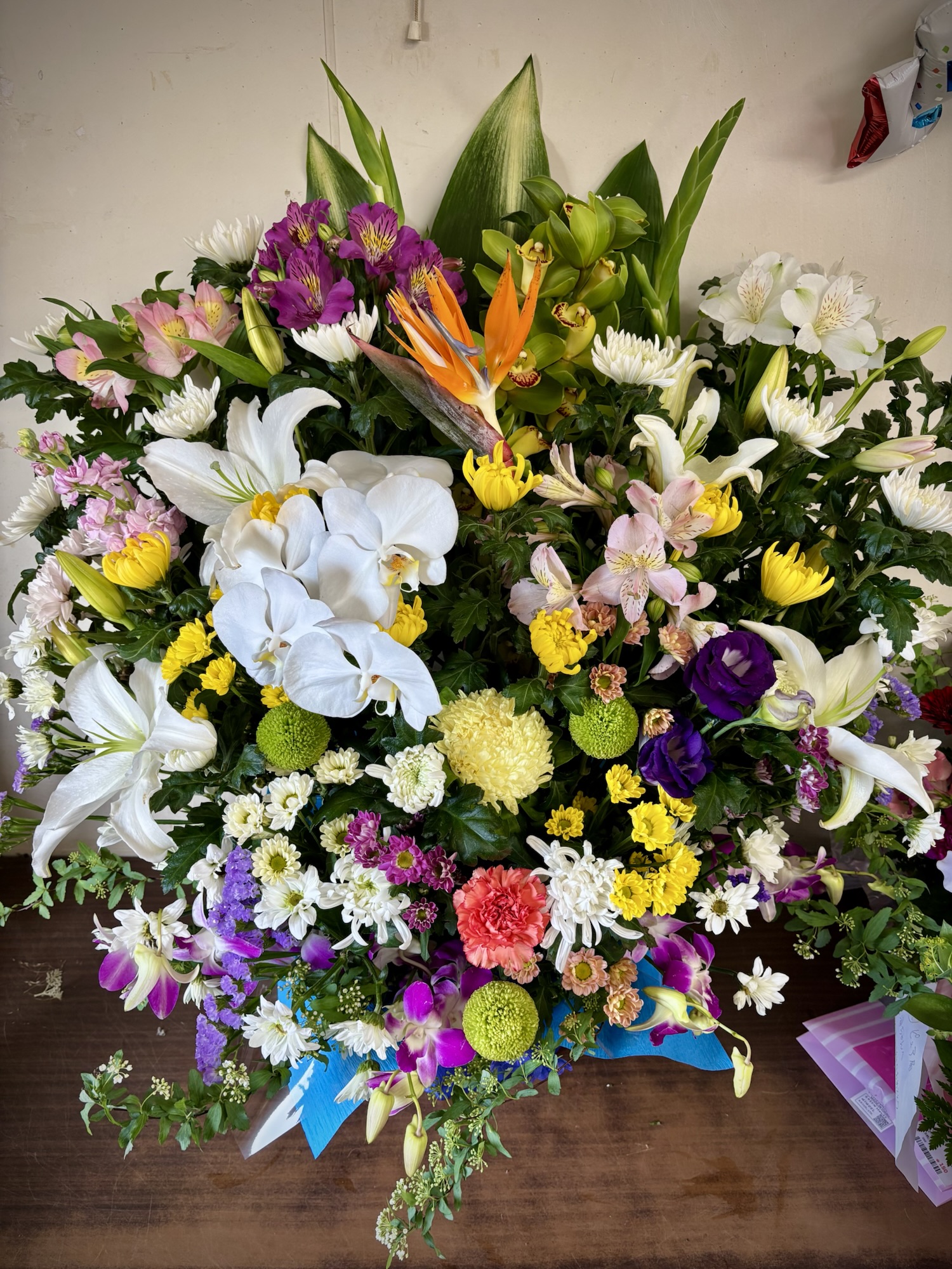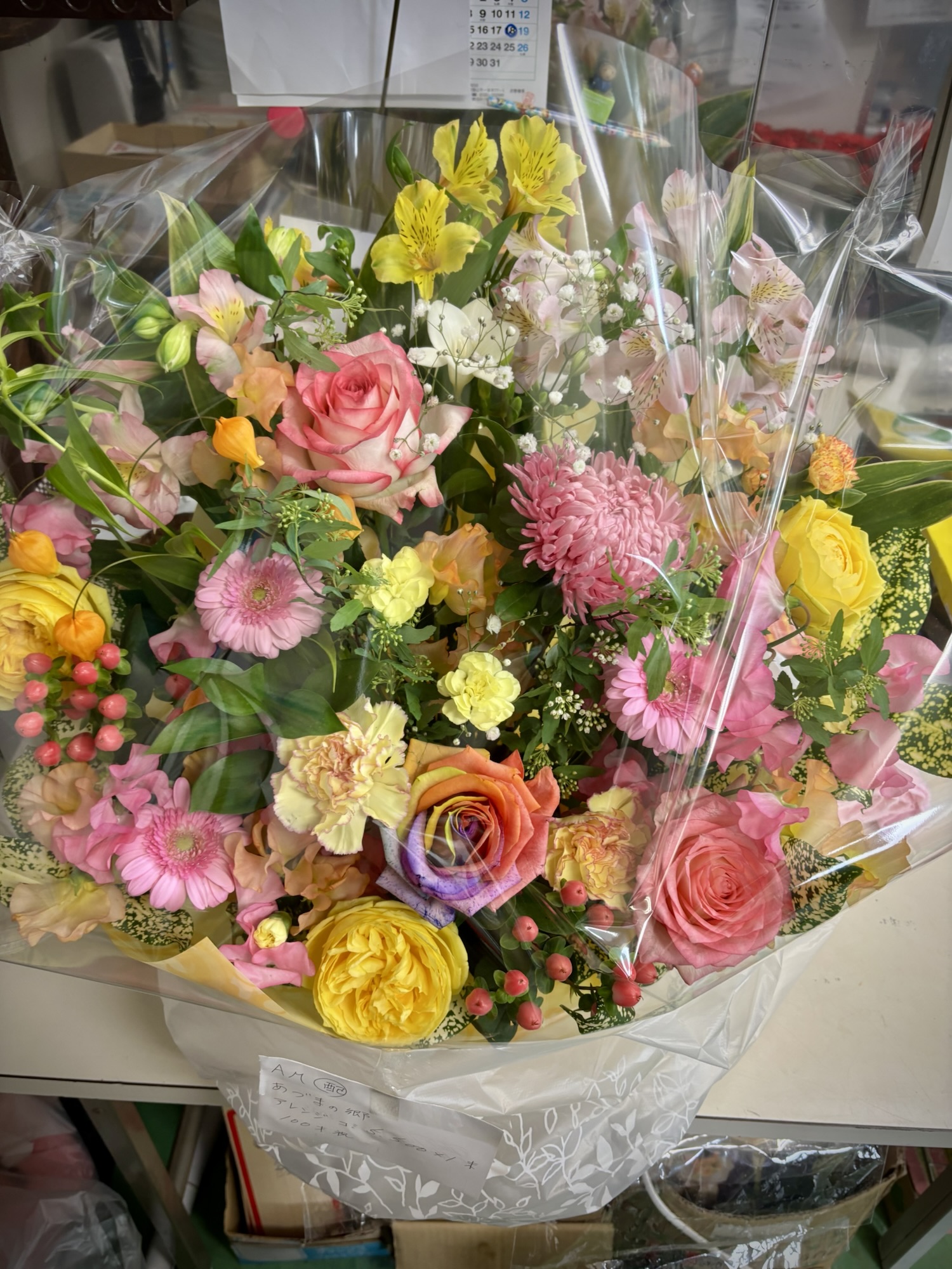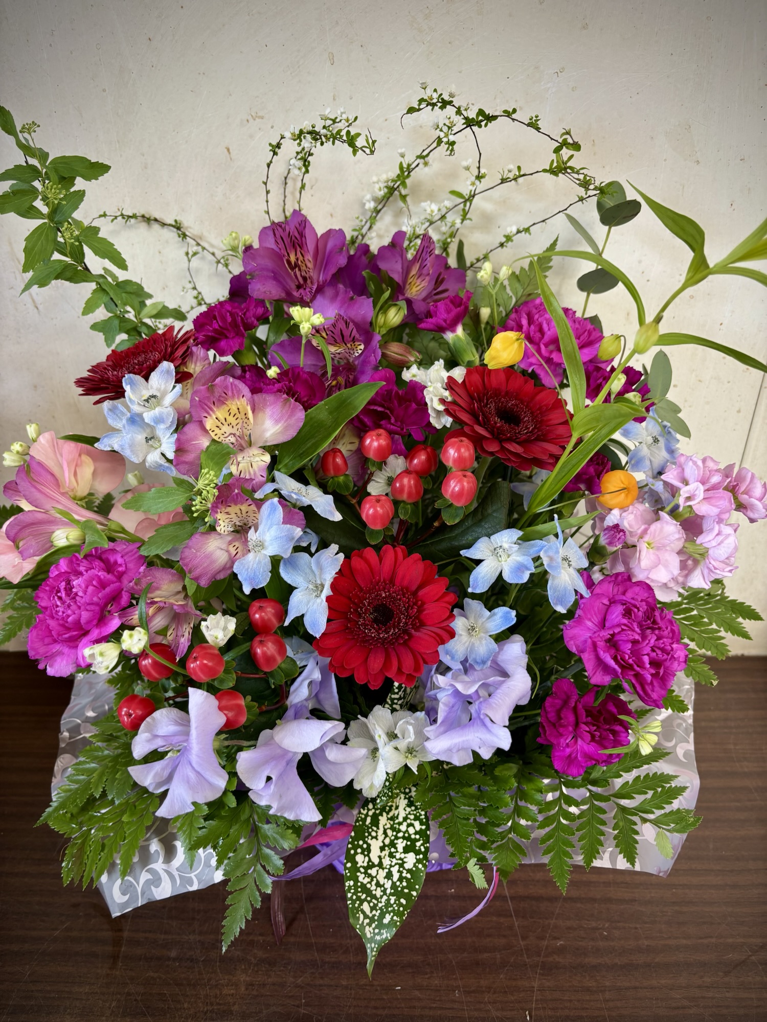 - 色はピンク、赤、黄色、オレンジ、青、水色、紫、白等々…指定可能です。2色選ぶとまとまりのある出来になりやすいです(黄、オレンジなど)。